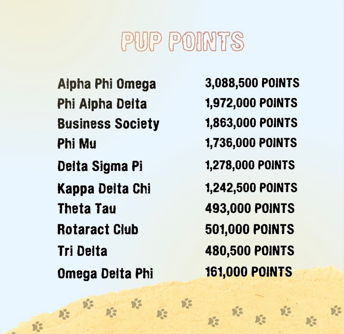 Our 1st Annual Paws for a Cause was led by Sogoli Fahr! Under her vision of our philanthropy week as our Parliamentarian, Alpha Kappa Psi was able to raise around $7000 and had 10 organizations participate! She introduced some of the core events that we still do annually such as Smooch the Pooch and our infamous DOG BALL tournament! Congratulations to Alpha Phi Omega for winning Paws for a Cause 2023!